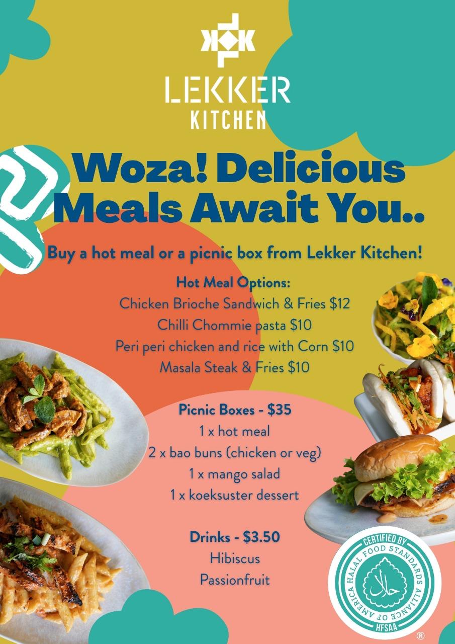 Enjoy the sunset and good company with freshly prepared halal meals from Lekker Kitchen. Choose from tasty hot meals like Chicken Brioche Sandwich & Fries, Masala Steak, or Peri Peri Chicken with Rice, or grab a Picnic Box packed with a full meal, bao buns, mango salad, and a sweet koeksuster dessert.