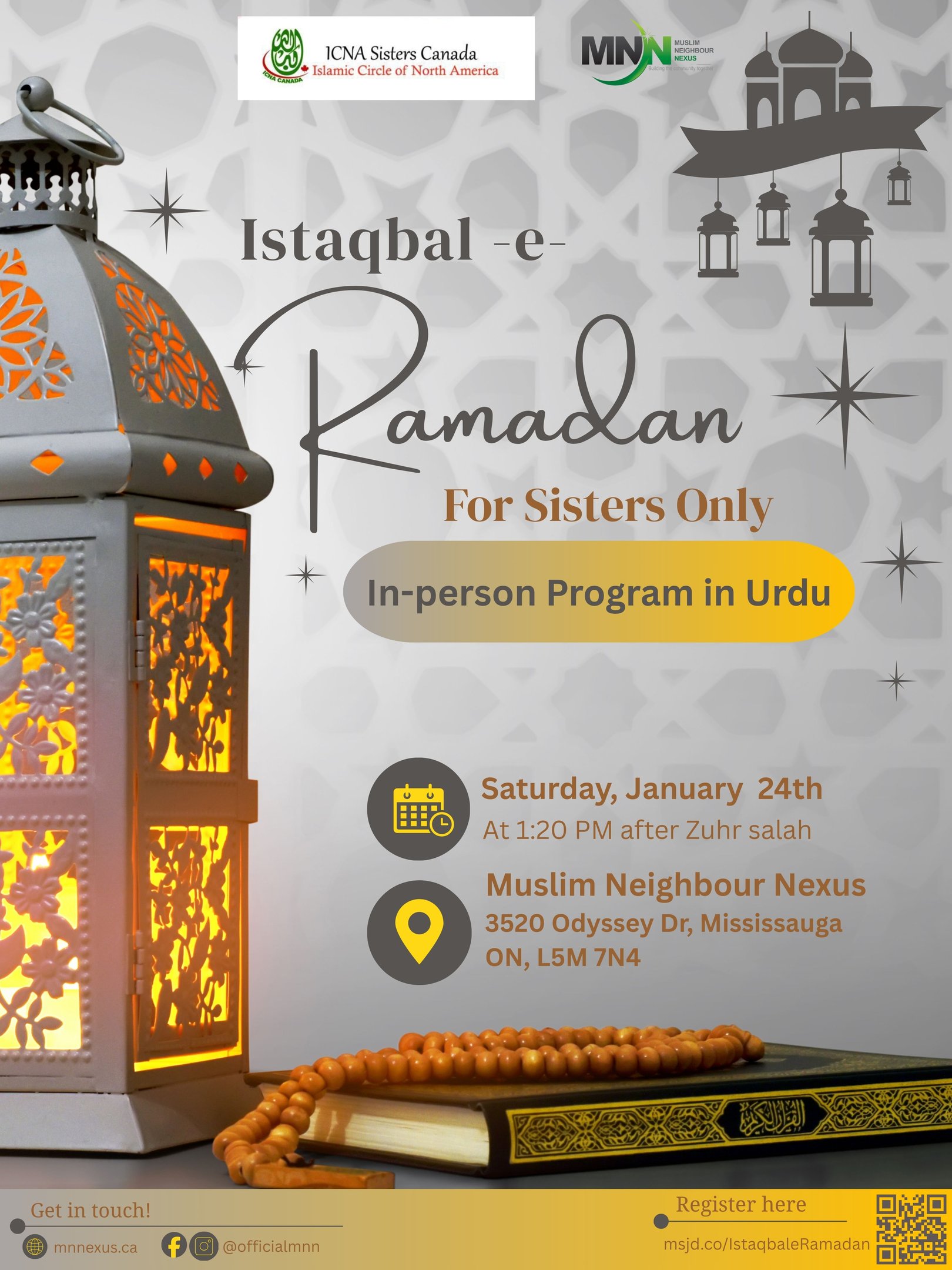 Join us for Istaqbal-e-Ramadan, a sisters-only in-person program in Urdu, as we spiritually prepare our hearts and minds for the blessed month of Ramadan. This gathering offers reflection, inspiration, and a meaningful opportunity to reconnect with our purpose and faith. We look forward to welcoming you for an uplifting afternoon of learning and spiritual renewal at Muslim Neighbour Nexus.