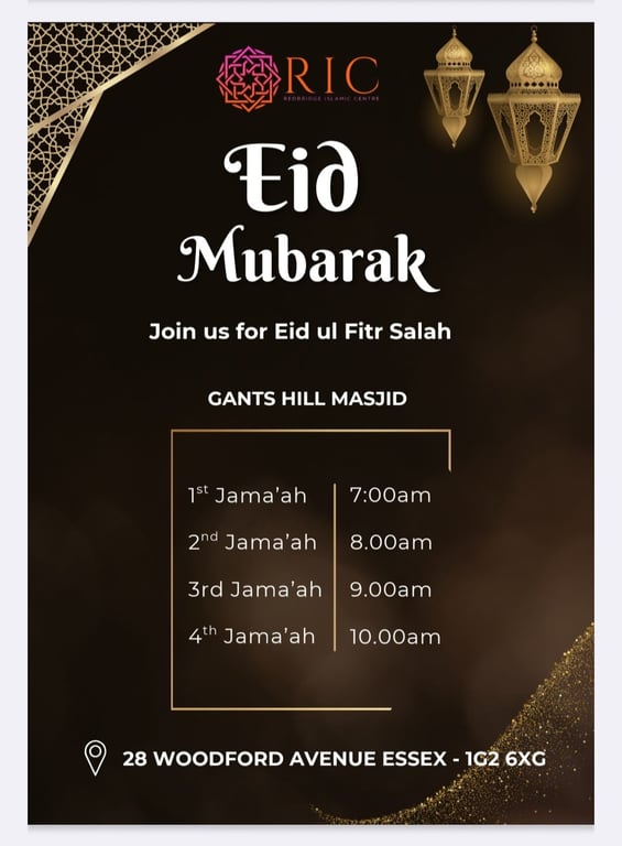 Assalaamu Alaykum, please find Eid Salah timings for Gants Hill Masjid
